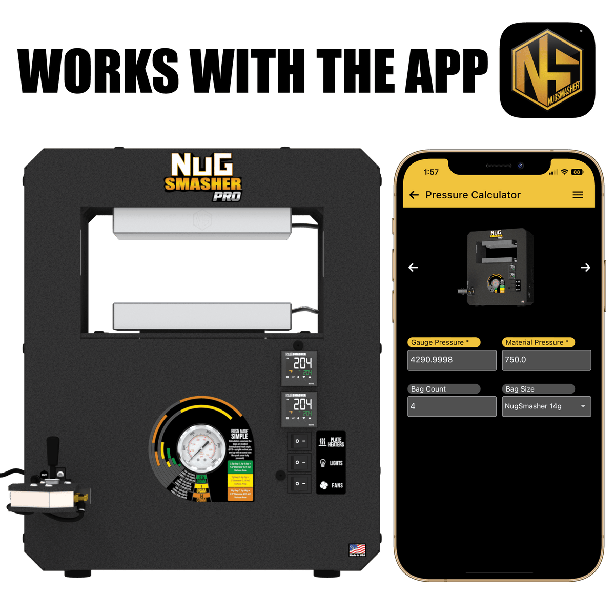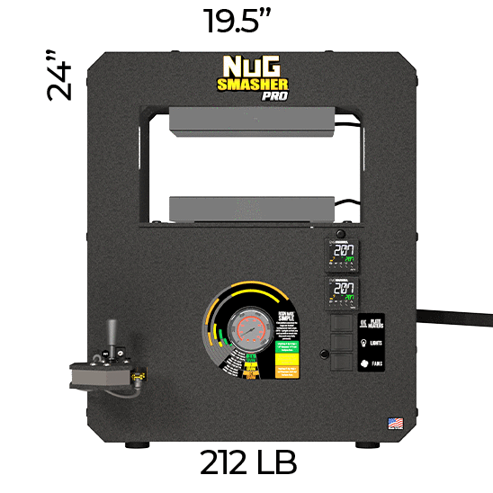 The NugSmasher PRO is the ultimate commercial rosin extractor, ideal for medium to large-scale businesses needing maximum production. With 7” x 10” smash plates, it can extract up to 100 grams per press. Each plate has 3 heating elements for consistent temperature control and a precise pressure gauge for optimal rosin quality. This 212-lb machine features dual pressure control, offering thumb-operated pneumatic and manual control to exert up to 20 tons of pressure. The plug ‘n play system works with 3.5, 7, or 14-gram bags. Made from solid steel, it has a fully-fabricated and CNC-machined frame, making it one of the toughest and highest-capacity machines available.