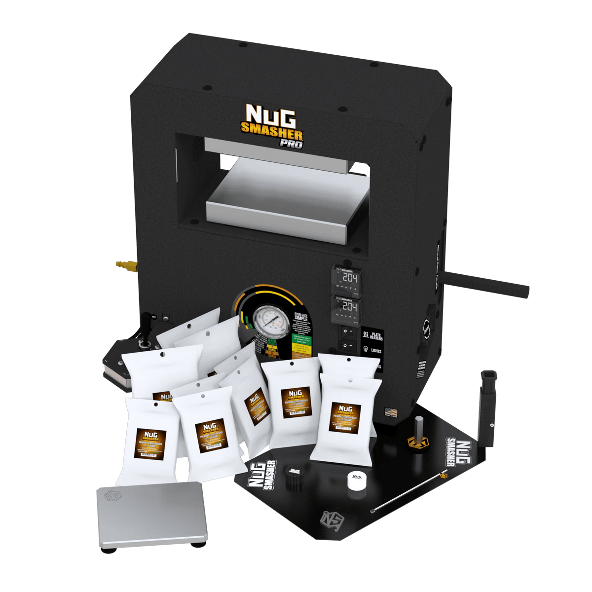Made for industrial use, the NugSmasher Pro Basic Bundle gives users the accessories needed to start pressing. Featuring the full lineup of extraction bags and multiple mats and tools to get everything started.