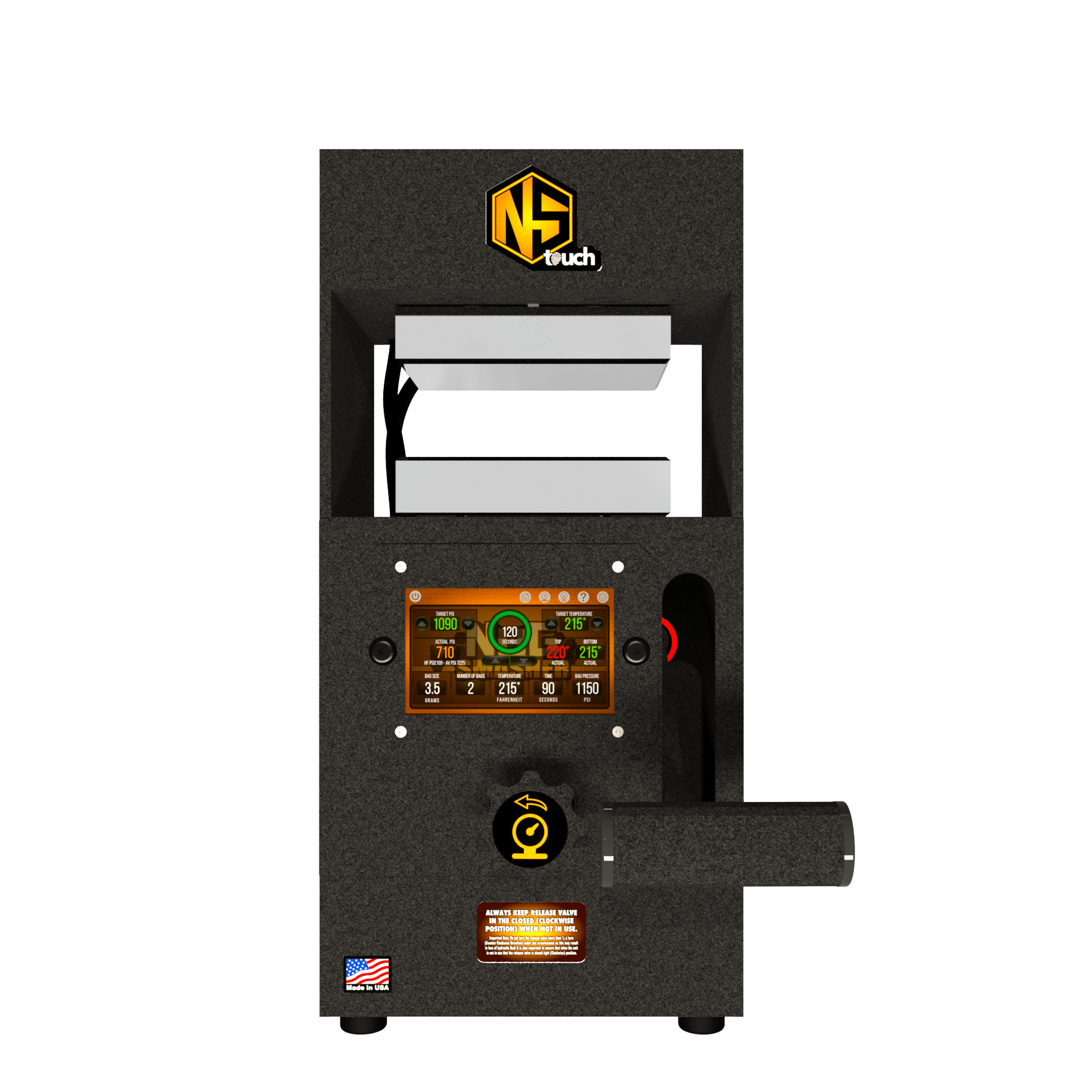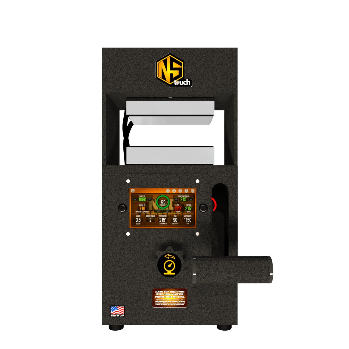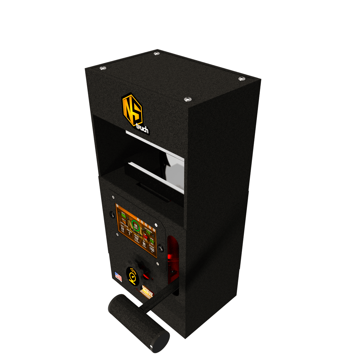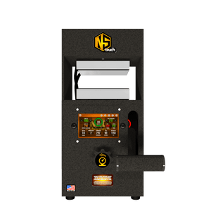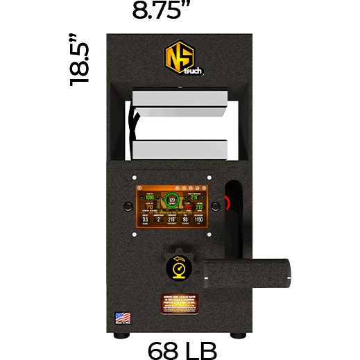 The Nugsmasher Touch offers up to 12 tons of precise pressure with a custom surface size. It features the Interactive Extraction Brain, a 5-inch touchscreen computer for controlling extraction settings. This system provides three types of precise digital PSI measurements and computes surface area for optimal pressure. Firmware updates add new functions. It uses 4 x 6-inch steel plates with four 160-watt heating elements for even heat distribution. Built with solid steel, it comes with a limited lifetime warranty.