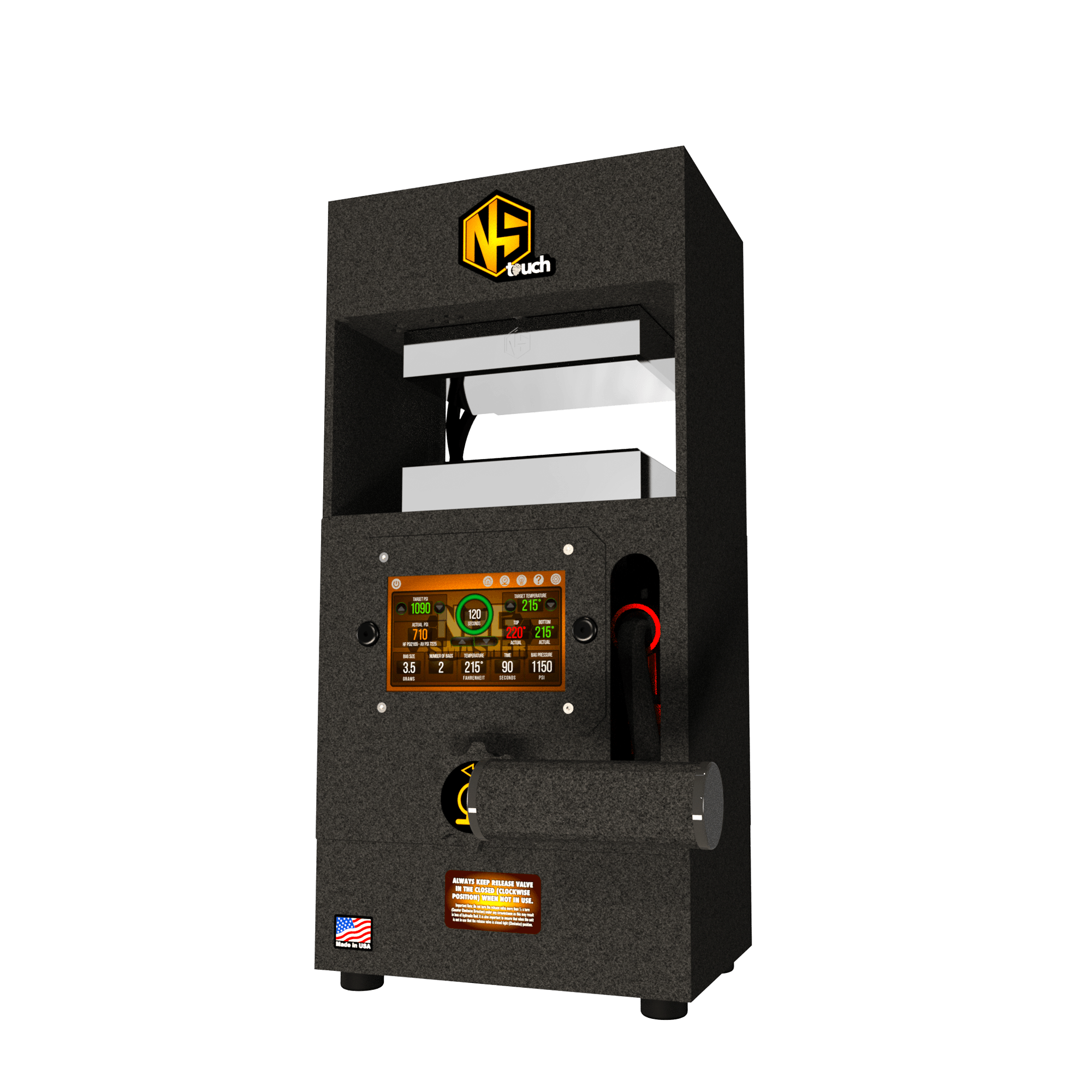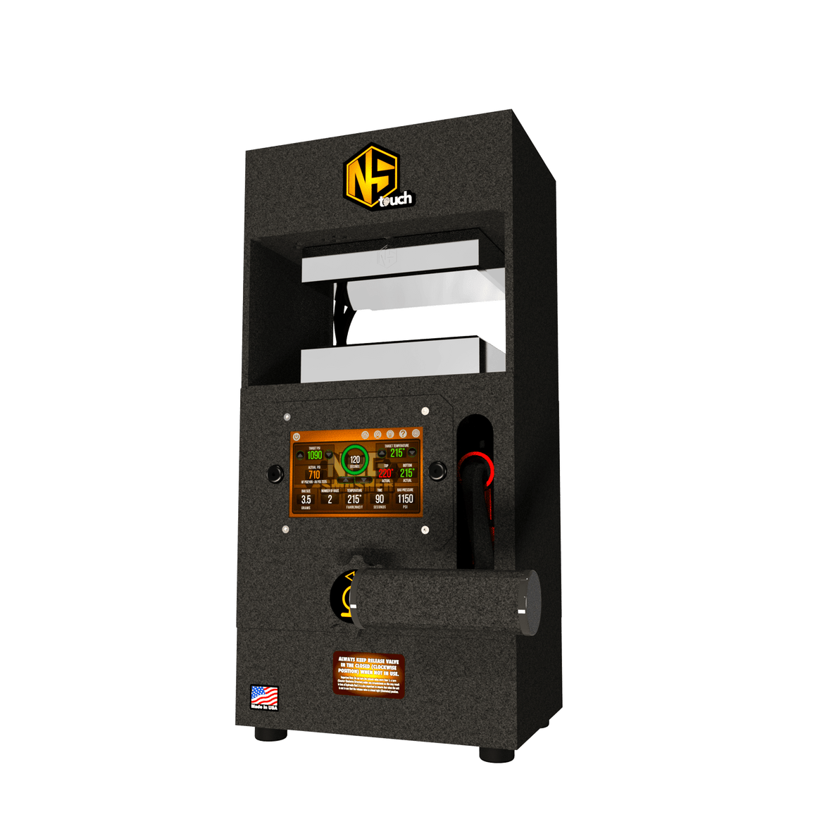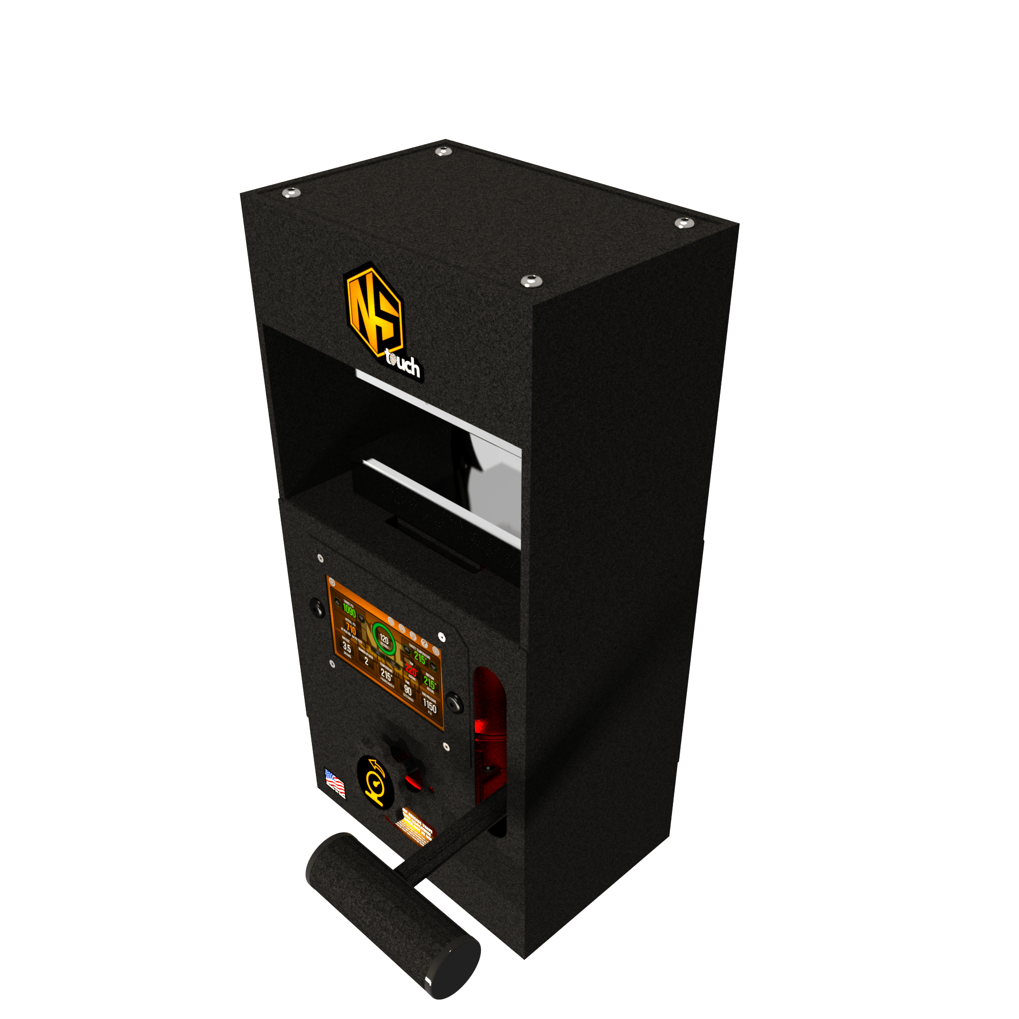 The Nugsmasher Touch offers up to 12 tons of precise pressure with a custom surface size. It features the Interactive Extraction Brain, a 5-inch touchscreen computer for controlling extraction settings. This system provides three types of precise digital PSI measurements and computes surface area for optimal pressure. Firmware updates add new functions. It uses 4 x 6-inch steel plates with four 160-watt heating elements for even heat distribution. Built with solid steel, it comes with a limited lifetime warranty.