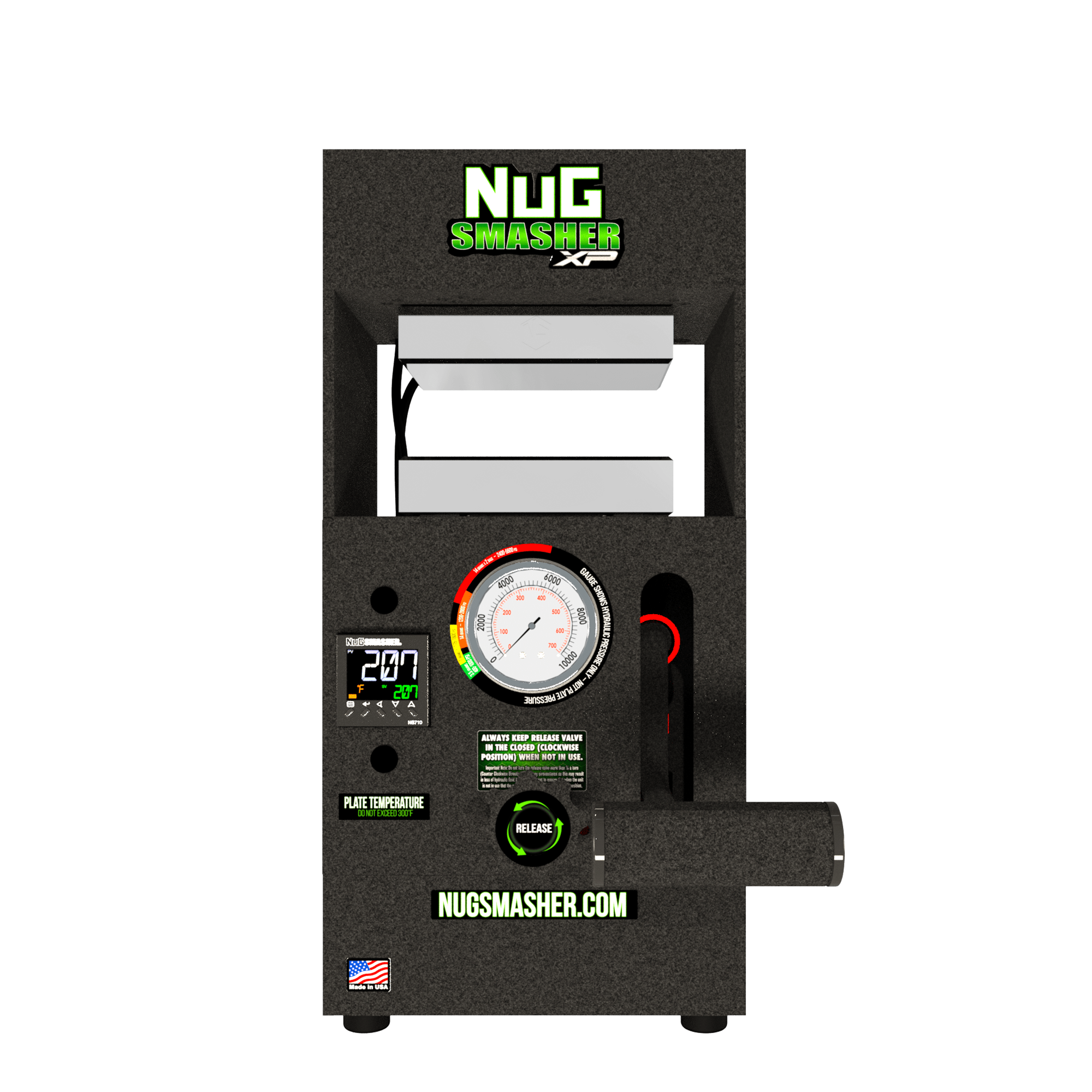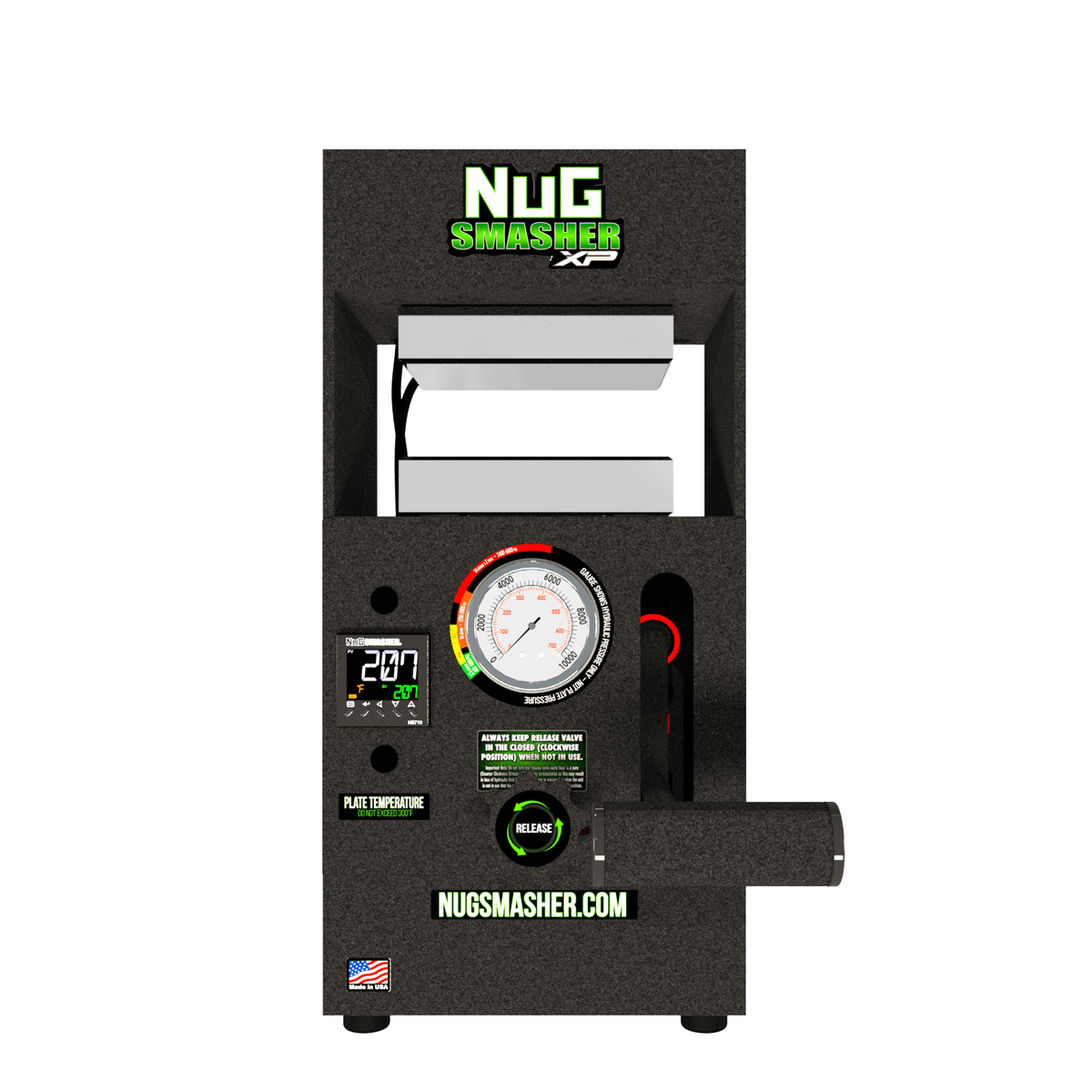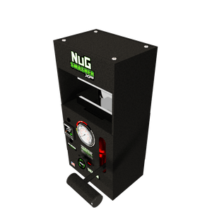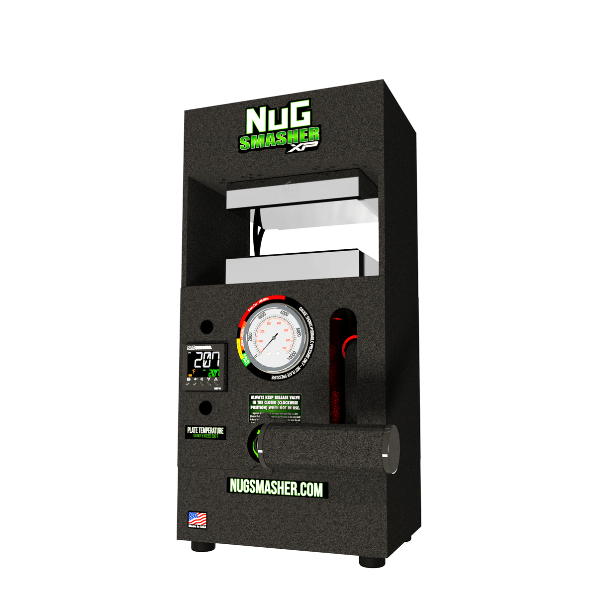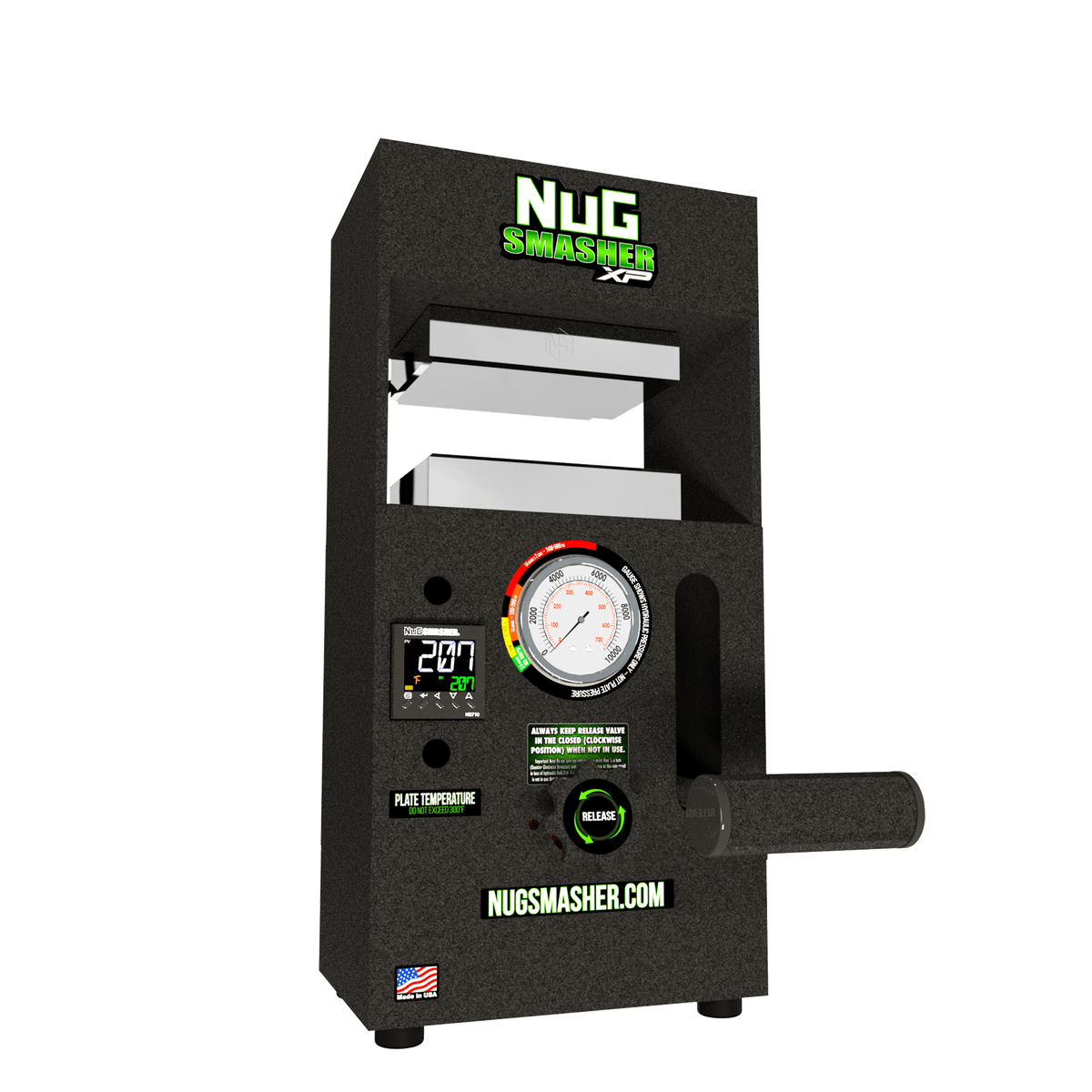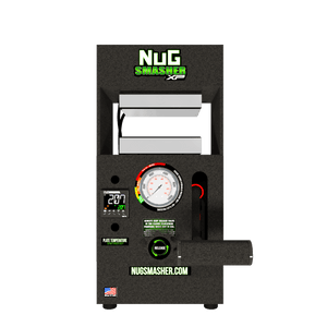 The NugSmasher XP is a larger, manually-operated rosin extraction system designed for higher commercial productions. With 6” x 4” Quad Heated Smash Plates and up to 12 tons of pressure, it can extract up to 28 grams of rosin. Its 82-pound solid steel body houses an Accurate Pressure Gauge and Control for consistent, high-yield production, regardless of bag size.
