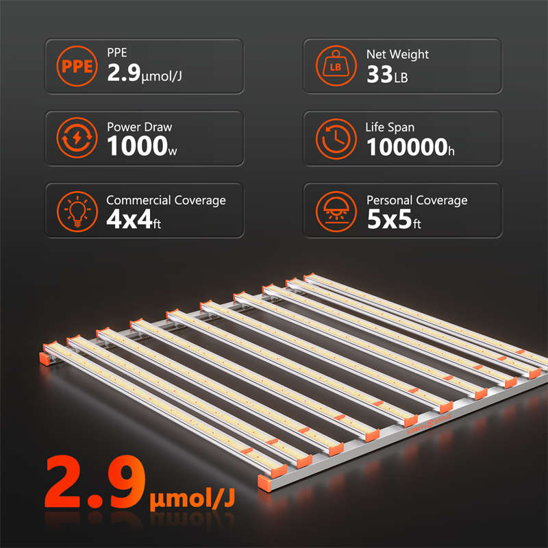 1000 watts. The innovative extended bar configuration provides maximum uniformity and efficiency with more even and full canopy coverage, especially to the outer cultivation areas.
