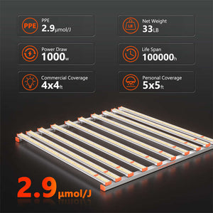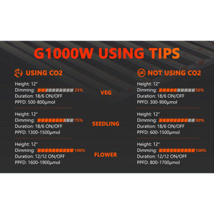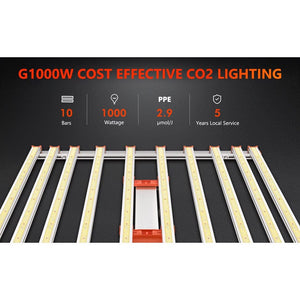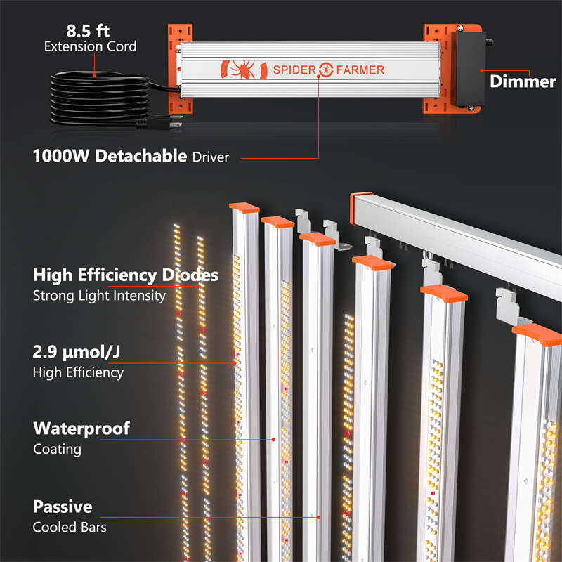 Spider Farmer G1000W Full Spectrum LED Grow Light features new improved diodes that make it even more efficient, delivering the same advanced technology as the SE series while utilizing cost-effective Bridgelux diodes for maximum value.