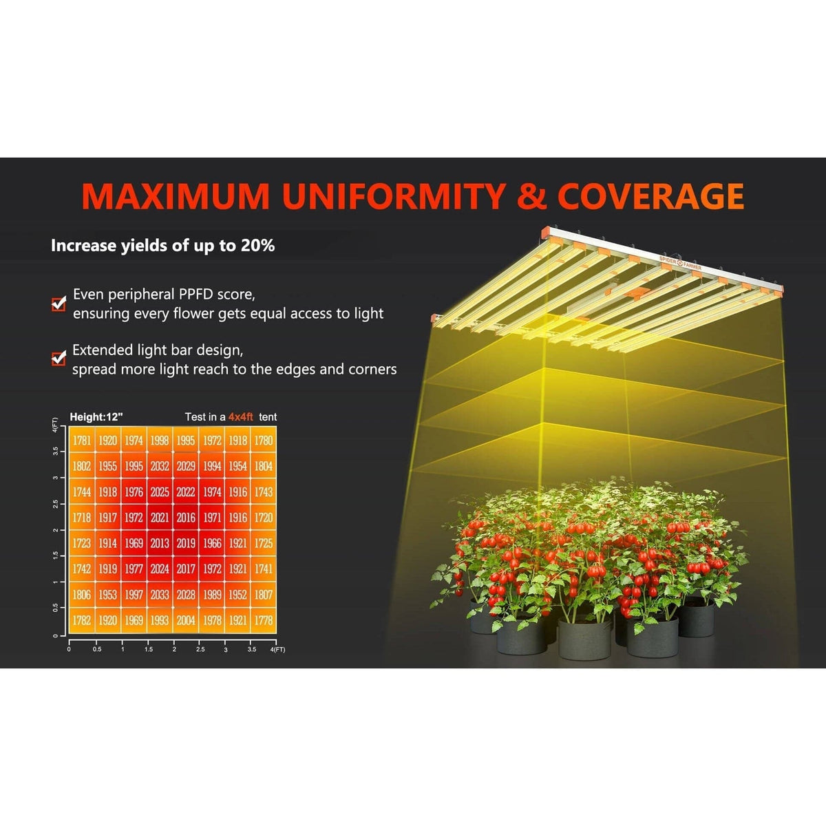 Maximum uniformity with extended 8-bar design and 4910 improved Bridgelux diodes delivering 2924 umol/s PPF