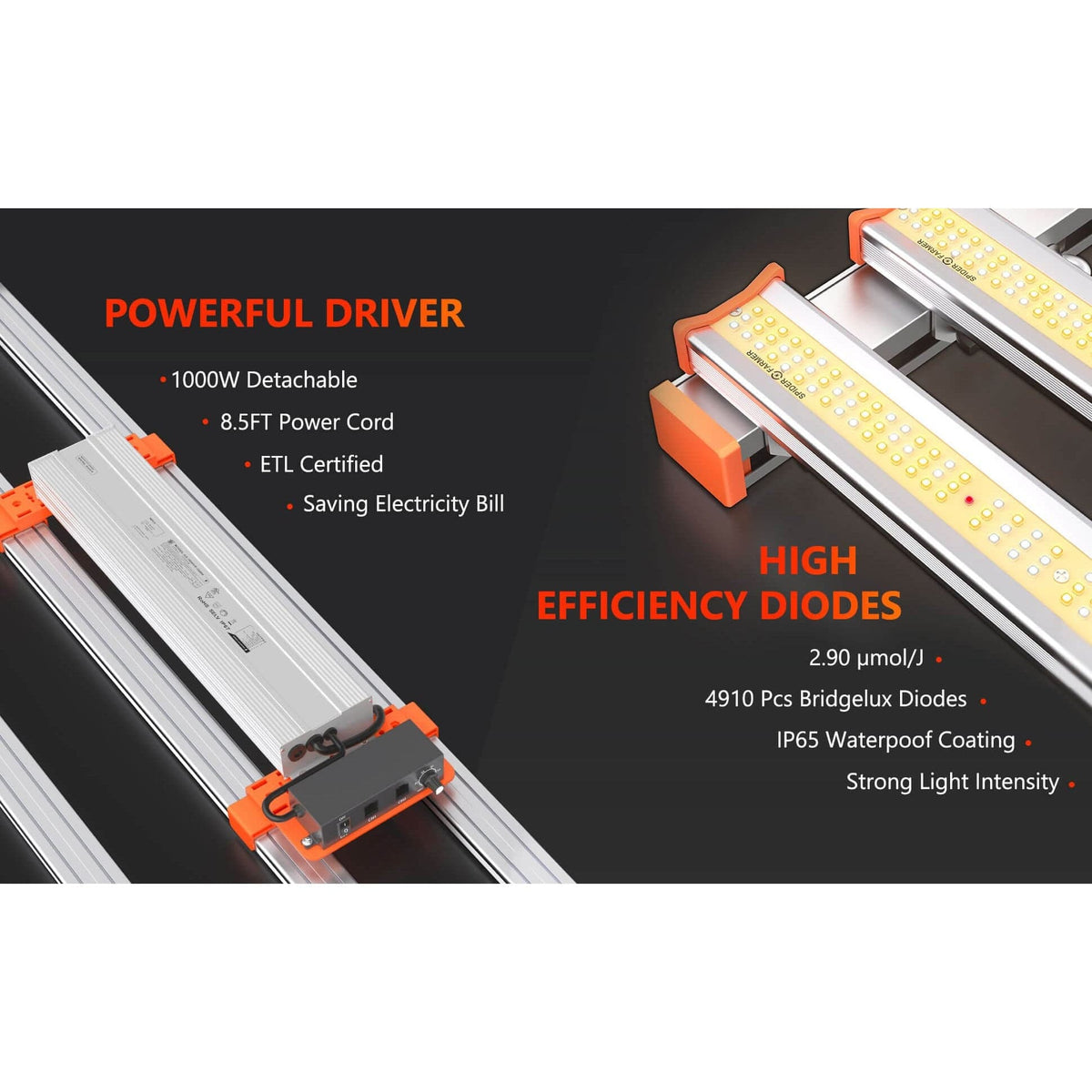 detachable driver with 8.5-foot power cord reduces ambient heat in growing spaces for extended lifespan.