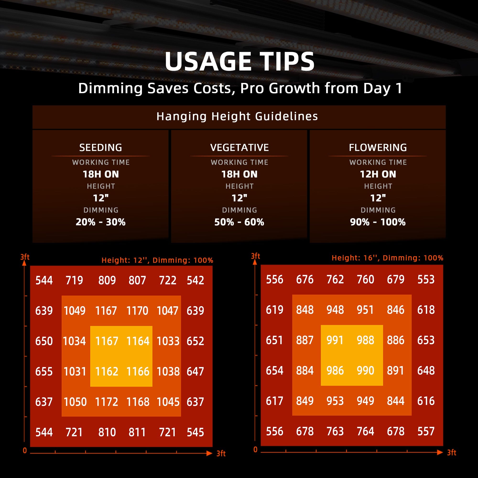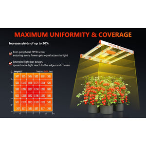 The advanced full spectrum lighting with UV & IR includes UV 405-415nm, IR 660-665nm, 730-740nm, 3200-4200K, and 4800-5000K wavelengths perfect for every stage of plant growth from seed to harvest. The added UV and IR light effectively promote robust stem growth as well as enhanced flower and fruit production.
