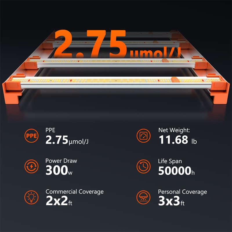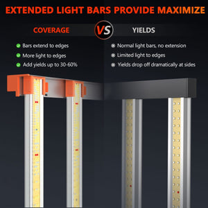 This efficient lighting system features a unique elongated light bar design with 896 Bridgelux diodes generating 829 umol/s PPF with an impressive 2.75 umol/J efficiency while consuming 300 watts. The extended configuration provides uniform and comprehensive canopy coverage, especially at the edges of the cultivation area, covering 3'x3' plant growth throughout the complete cycle.