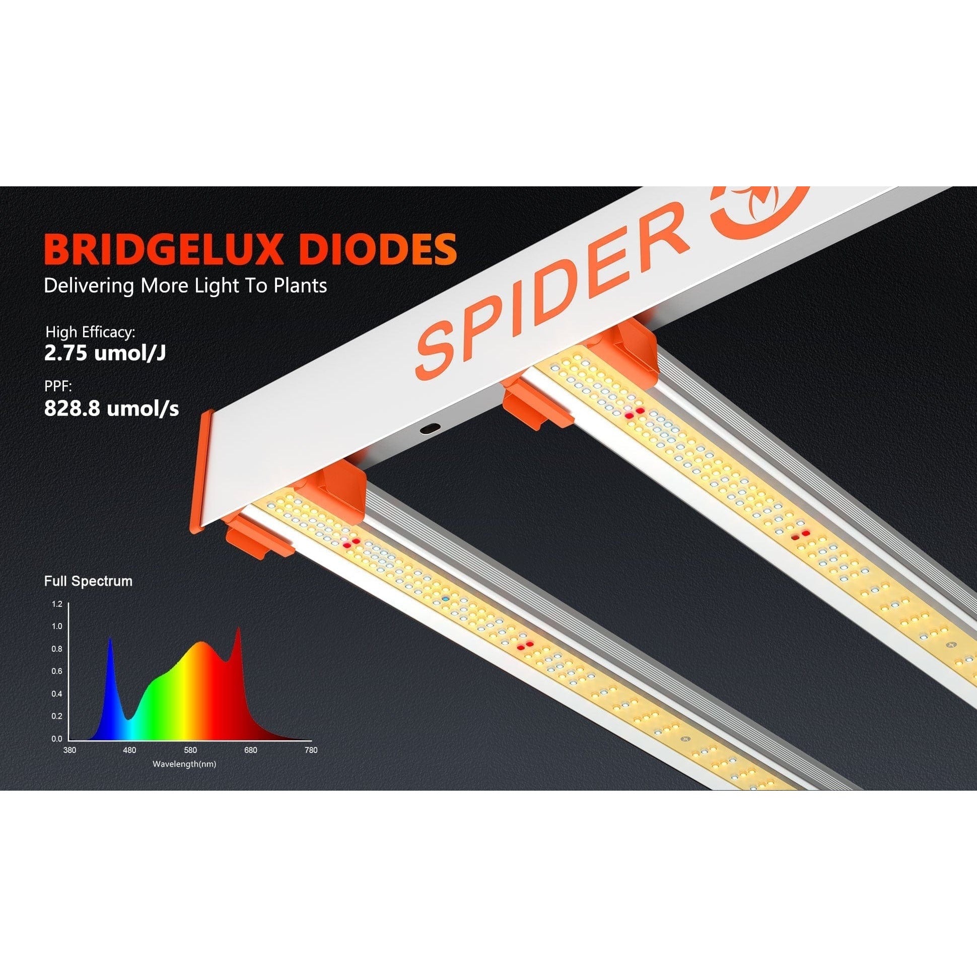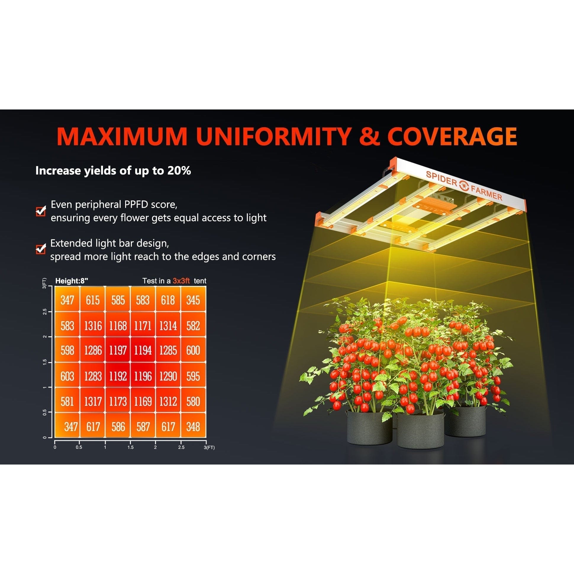 The Spider Farmer G3000's unique elongated light bar design with 896 Bridgelux diodes provides uniform and comprehensive canopy coverage, especially at the edges of the cultivation area. This ensures complete 3'x3' plant growth coverage throughout the entire cycle with 829 umol/s PPF output.