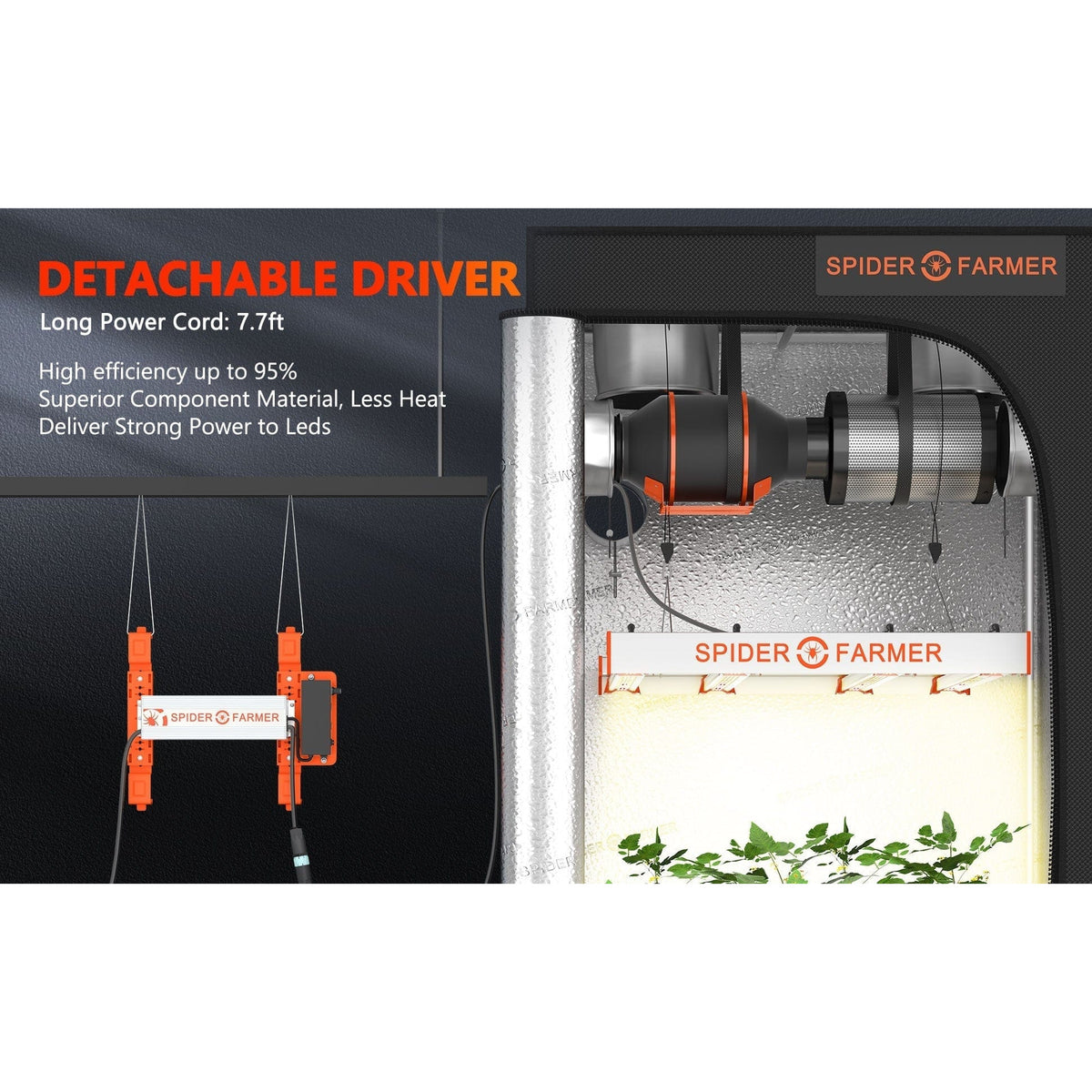 The Spider Farmer G3000's strip grow light design with aluminum heat sink on the back promotes superior air circulation and fast heat dissipation. The removable driver with 7.7-foot power cord can be mounted remotely to reduce ambient heat in the grow space, extending fixture lifespan significantly.