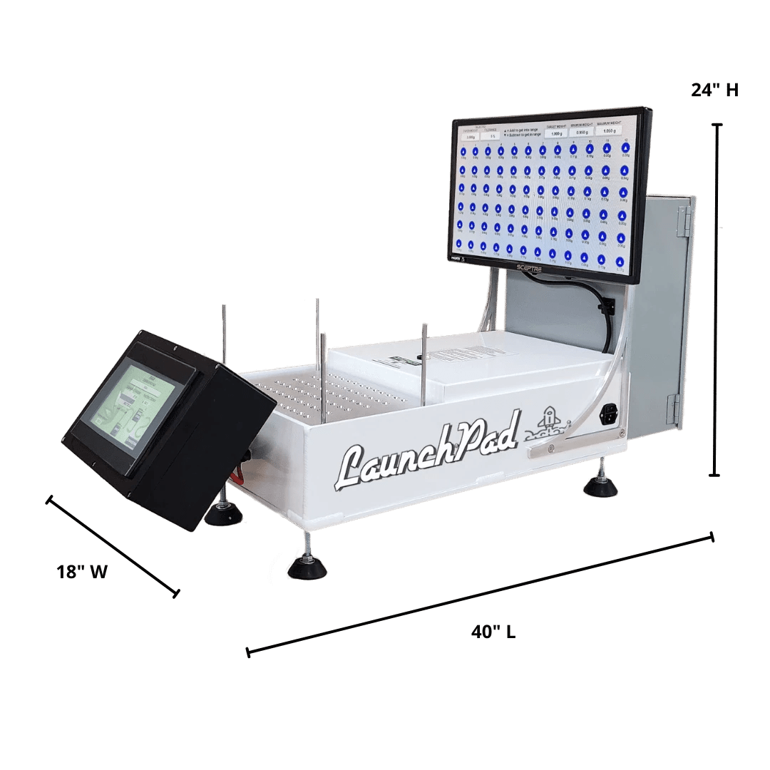 STM LaunchPad Pre-Roll Scale saves time and money by letting you discover rejects and adapt your operation. It weighs 72 pre-rolls simultaneously, and its color-coded display makes it easy to assess whether a pre-roll is appropriate.