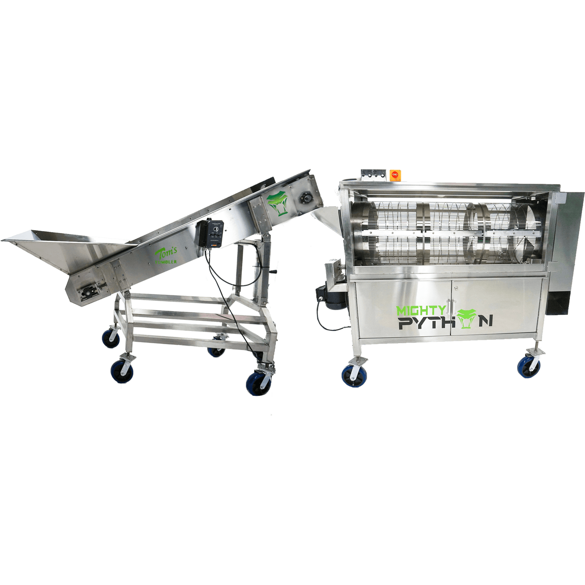 Built with food-grade rubber construction that prevents static charge accumulation, ensuring material moves gently through each stage of your trimming process. The stainless steel frame provides durability while maintaining the compact design perfectly matched in height to integrate seamlessly with the MIGHTY PYTHON.