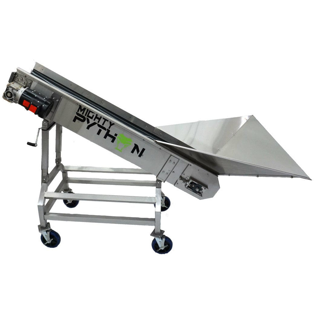 This food-grade belt conveyor is designed specifically for feeding material into the MIGHTY PYTHON Trimmer, handling