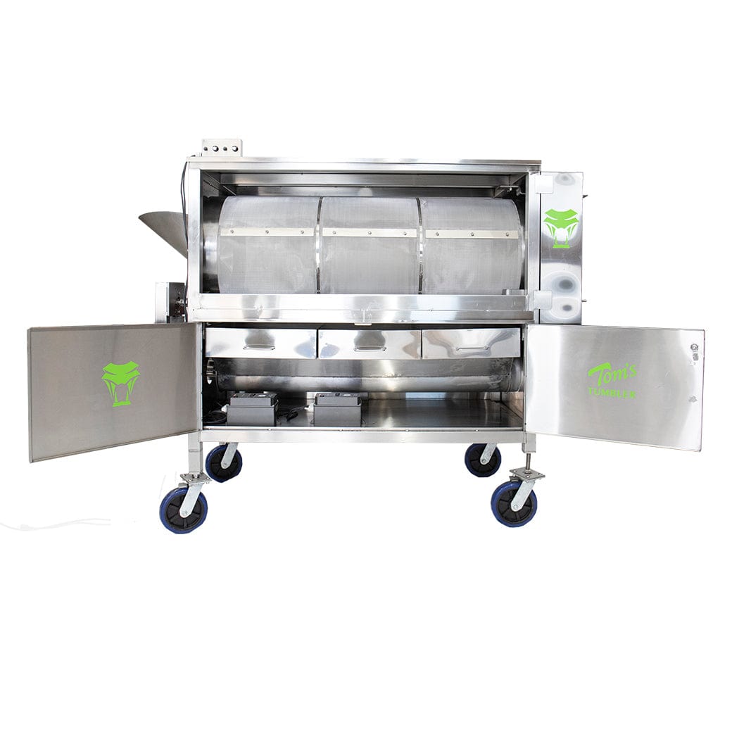This industrial bud trimming machine combines Tom's renowned bladeless trimming system with large-scale processing capabilities, eliminating the need for loud motors and vacuum systems while delivering consistent results.