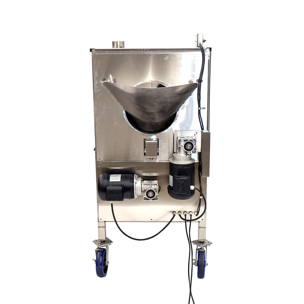 The system operates through a gravity-fed tumbling chamber that processes material through