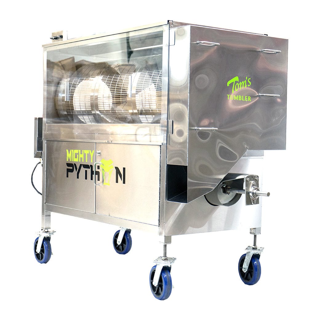 The Mighty Python flower trimming machine here is fed by a gravity feed or tumbling chamber via a CONVEYOR BELT. The chamber tumbles at 35 RPM as the product moves through 3 chambers of mesh netting in less than 5 minutes and exits perfectly trimmed.
